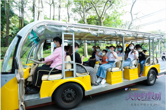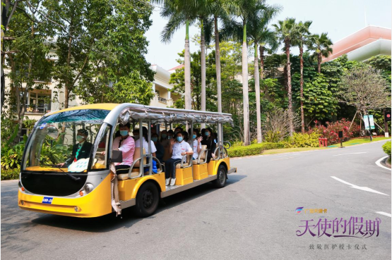 4月10日,“天使卡赠天使”致敬医护授卡仪式在东莞塘厦三正半山温泉酒店举行。东莞市援鄂医疗队56名白衣天使乘坐益高电动观光车来到了活动现场。