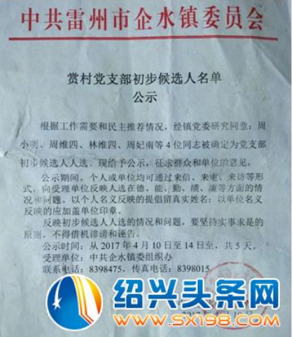 更加令人愤慨的是,企水镇党委不但没有对林维四的违法违纪行为作出处理,而且,公示林维四为赏村党支部人选(2017年4月11日)。公示期间,村民们投诉无果,任命为赏村党支部副书记。