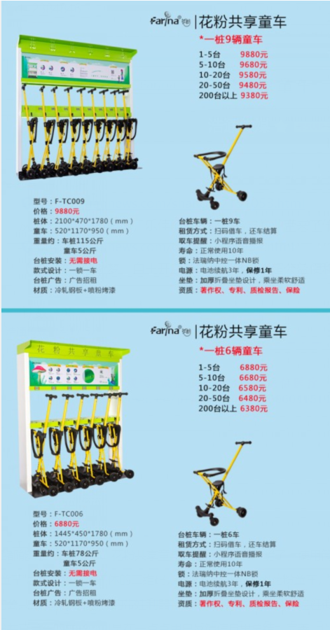作为共享经济中的花粉共享童车,有效解决了家长携带孩子出现于景区、公园、商场等较大的公共空间时成为家长的带娃利器,在尽享亲子时光里,遛娃逛街两不误。为亲子家庭提供出行便捷的自助童车租赁服务。