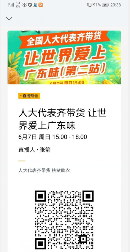 人大代表也来企业微信直播带货了!6月7日15:00,“让世界爱上广东味”(第二站)将正式启动,五位全国人大代表覃春辉、蔡仲光、周海波、蔡卫平和黄细花也从心系民生的两会“带题主播”转变成了助农增收的“带货主播”,通过企业微信为农特产品直播带货, 助力广东省文旅行业和农业经济复苏,为脱贫攻坚贡献力量。