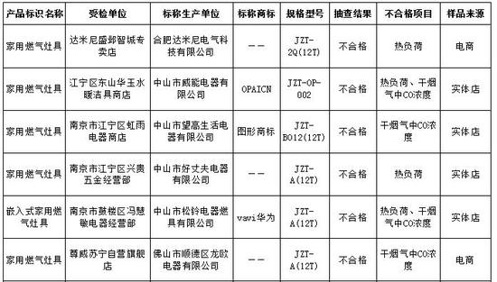 标称合肥达米尼电气科技有限公司生产的型号为JZT-2Q(12T)的家用燃气灶具,不合格项目为热负荷;标称中山市威能电器有限公司生产的型号为JZT-OP-002的家用燃气灶具,不合格项目为热负荷、干烟气中CO浓度;标称中山市望高生活电器有限公司生产的型号为JZT-BO12(12T)的家用燃气灶具,不合格项目为干烟气中CO浓度;标称中山市好丈夫电器有限公司生产的型号为JZT-A(12T)的家用燃气灶具,不合格项目为热负荷;标称中山市松铃电器燃具有限公司生产的型号为JZT-A(12T)的嵌入式家用燃气灶具,不合格项目为热负荷、干烟气中CO浓度;标称佛山市顺德区龙欧电器有限公司生产的型号为JZT-A(12T)的家用燃气灶具,不合格项目为干烟气中CO浓度。(来源: 慧聪家电网 )