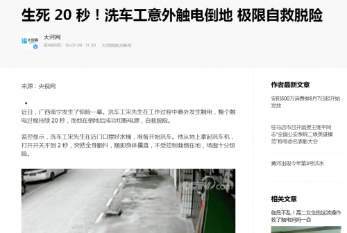梳理发现,如2016年,因洗车机存在质量问题,19岁少年在洗车时发生漏电事故,不幸殒命;2019年5月,海南三亚一名男子使用洗车机洗车时设备发生漏电,拿起高压水枪不到5秒的时间,就突然身体紧绷,仰面倒在地上,不慎触电身亡;2019年7月,广西南宁发生了惊险一幕,一名男子在洗车中意外发生触电,整个触电过程持续 20 秒,幸亏他在倒地后成功切断电源,自救脱险……