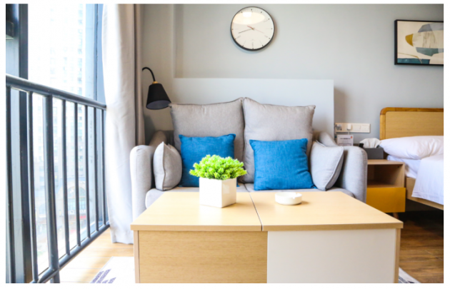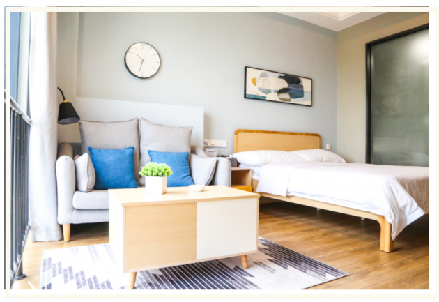 一呆公寓(展览中心店)的居住环境根据符合年轻人喜欢的风格而设计,整个房间宽敞明亮,各种居家配套设施齐全。宜家风的布艺沙发搭配一个简约茶几,除了让整个房间搭配更加丰富外,实用功能也是不可小觑的,不管是自己使用还是朋友来访都有一个足够的位置 。