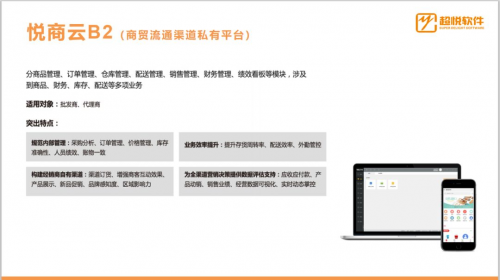 悦商云B2——专注于打造经销商全渠道流通Saas服务,融合线上线下一体化运营能力,在线上环节,基于在线营销平台,进行全渠道拓客,多种营销玩法助力成交,提升平台变现能力;在线下环节,高效打通进货、销售、库存、财务、仓储、配送、以及数据分析等全业务流程。