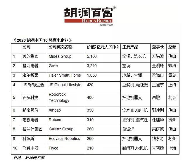 该榜单列出了中国十强本土家电企业,按照企业市值或估值进行排名。上市公司市值按照2020年9月30日的收盘价计算,非上市公司估值参考已公开的、最新一轮融资估值,或参考同类上市公司估值。