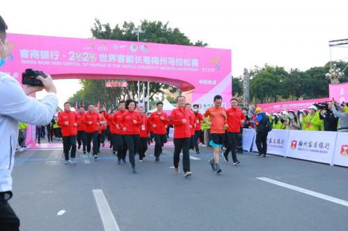 上午7点30分,梅州市委书记、市人大常委会主任陈敏,梅州市委副书记、市长张爱军,广东省委统战部副部长、省工商联党组书记雷彪,中国田径协会社会活动部委员刘芬,梅州市委常委、常务副市长吴晓晖,梅州市委常委、市纪委书记、市监委代主任蒋万军,梅州市委常委、市政府副市长孙春明,梅州市人大常委会副主任李远青,梅州市政府副市长张晨,梅州市政府副市长、梅县区委书记吴泽桐,梅州市政府副市长、市公安局局长宁惠军,广东宝丽华新能源股份有限公司董事长、梅州客商银行股份有限公司董事长宁远喜,广东宝丽华集团有限公司总经理温惠,广州工业投资控股集团有限公司党委委员、副总经理谢勇,广东新中体育集团有限公司联合创始人张振荣共同为赛事鸣枪。