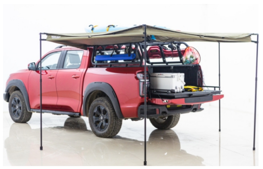 车身侧面配备来自澳洲的“犀牛”侧边帐,可实现270度展开,为户外钓鱼提供了更大更舒适的遮阳面积,可以惬意地在天幕下使用冰箱或钓箱。