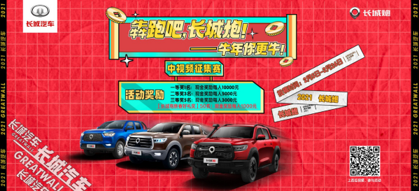 2月5日-2月26日,长城炮在西瓜视频平台启动#犇跑吧,长城炮#视频征集活动。不论你是热爱探险、旅游、骑行、改装,还是痴迷攀岩、越野、跑酷,只要上传视频并以#犇跑吧,长城炮#为主题,就能参与到赢取万元现金大礼活动中来。