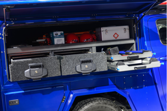 救援炮基于长城炮商用皮卡改装,货箱部分更改为救援移动仓,配备发电机、救生圈、破拆机、医疗箱、担架、氧气罐等专业救援装备;整车配备车载电台、远距离伸缩天线(中继天线)、攀爬梯等救援设备。