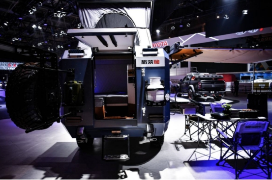 旅装炮采用空间拓展设计,侧方的床位采用斜拉式结构,行车过程中可以将床位升起,收缩到车厢内。车顶采用升降式结构,行车时将车顶降下,降低车身高度,减少风阻;驻车时升起,加强通风和采光,提高舒适性,让用户在旅途过程中可以随时驻营,饱览自然风光。