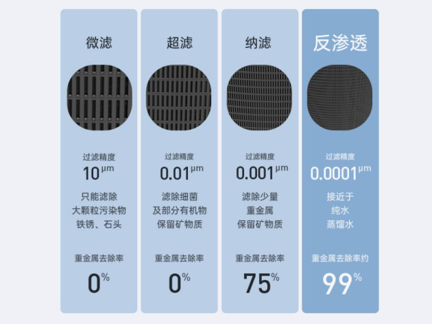 为什么要选择RO反渗透过滤技术?因为目前市面上大多纯水机和净水器都是采用微滤或超滤技术,但这两者都无法完全过滤水中的杂质、细菌及重金属;而有部分纯水机和净水器会采用纳滤,但也只能过滤75%的重金属物质;因此RO反渗透膜过滤便是这其中效果最显著的,过滤精度可达0.0001微米,相当于一根头发丝的百万分之一,可有效过滤抗生素、细菌、无机盐、重金属等有害物质,滤净率高达99%,接近于蒸馏水的级别。