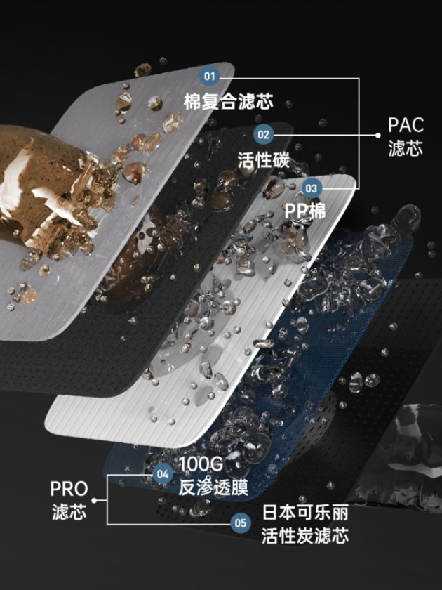 行业内不少净饮机产品只有4级净化,而惠而浦R100J61净饮机甄选三合一的PAC复合滤芯,内含棉复合滤芯、活性炭层及PP棉;配以2.0升级版的PRO滤芯,内含RO反渗透膜和日本可乐丽活性炭滤芯。双重净化过滤,过滤掉水中的泥沙、铁锈、胶体等大颗粒杂质,净化率高达99.9%,比一般产品多了一层活性炭复合层,可吸附异味,进一步提升口感。过滤后的水可直接达到直饮级别,确保了我们饮用的净化水是干净的。