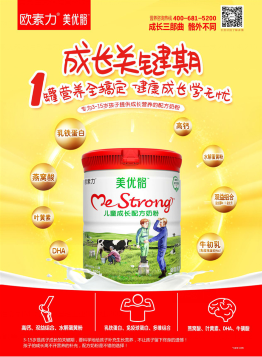 作为专业的中国婴童食品供应商,欧比佳乳业一直致力于为中国婴幼儿及儿童青少年的健康成长持续努力。相信在美优骼儿童成长配方奶粉的专业配方和精心呵护下,每一个孩子都能更加快乐、茁壮地成长,创造更多成长大不同!