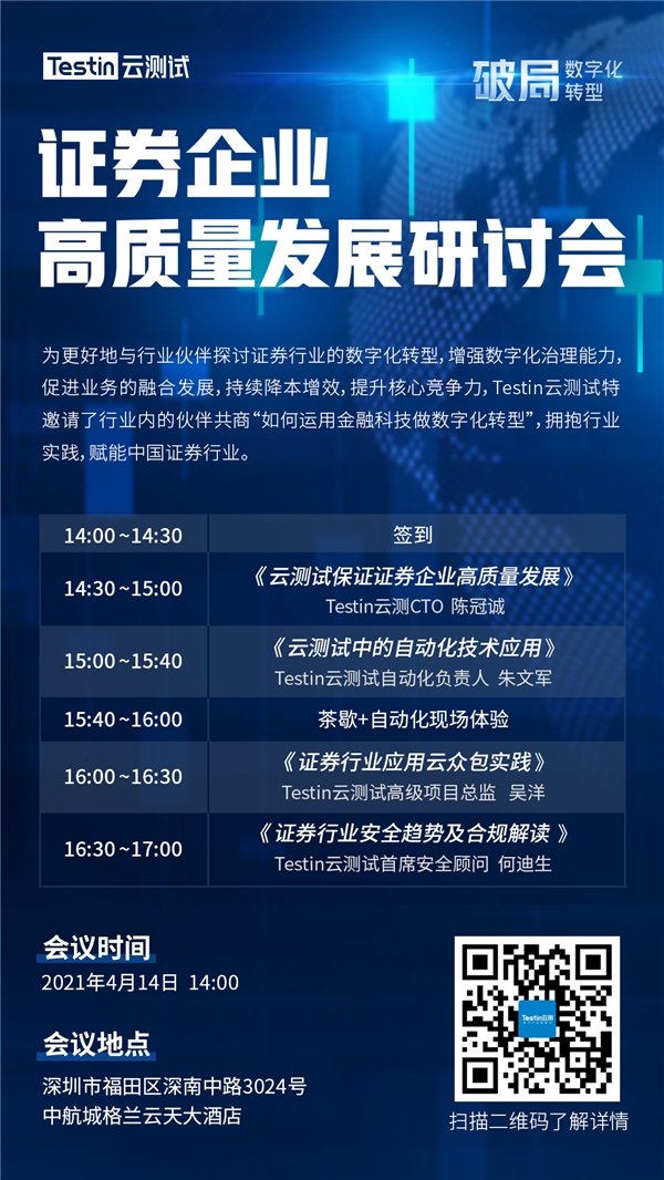 4月14日,由Testin云测试主办的“证券企业高质量发展研讨会”即将在深圳拉开帷幕,现场公开对外进行人员邀约,活动名额有限,点击下方的阅读原文即可参与报名。