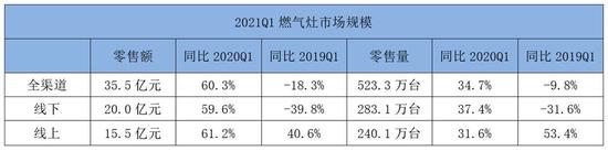 燃气灶方面,2021年一季度全渠道零售额为35.5亿元,同比增长60.3%,零售量为523.3万台,同比增长34.7%。