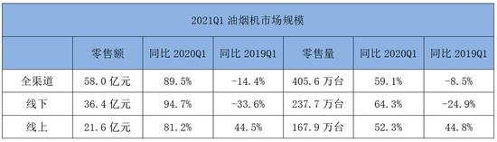 奥维云网数据显示,2021年一季度,油烟机全渠道零售额为58亿元,同比增长89.5%,零售量为405.6万台,同比增长59.1%。