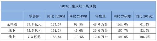 集成灶的涨势则更为喜人。2021年一季度,集成灶全渠道零售额达39.8亿元,同比大涨了163.3%,零售量达48.6万台,同比大涨了144.6%。