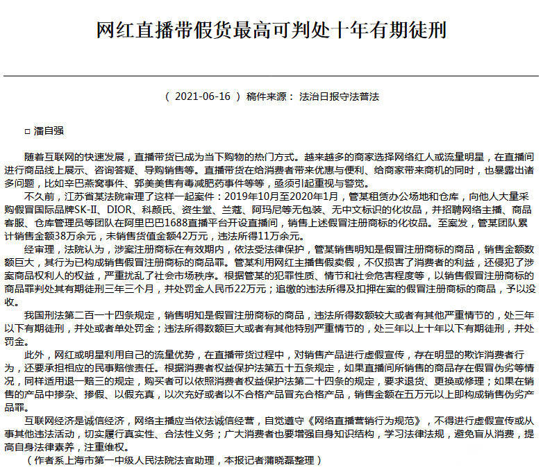最近,法制日报的一则讯息引起大家的广泛关注,事关当下风头正盛的直播行业。在互联网上,假货的问题屡禁不止,受到大家的广泛诟病。