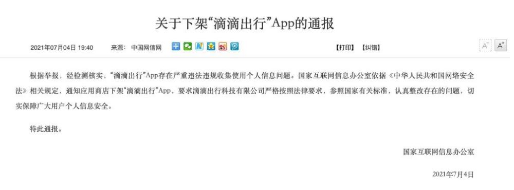 7月4日,国家互联网信息办公室网站发布《关于下架“滴滴出行”App的通报》。