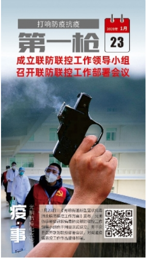 1月23日,《光明街道新型冠状病毒肺炎联防联控工作方案》发布,联防联控工作领导小组成立,打响了光明街道防疫抗疫的第一枪;1月31日,光明街道成立19个临时党支部,发出红小二征召令,吹响了防疫抗疫的集结号;2月5日,《光明街道新型冠状病毒感染的肺炎疫情防控社区卡点检查工作制度》发布,光明街道设置了112卡点,进行围合式管理,成功编织了防疫抗疫的安全网……