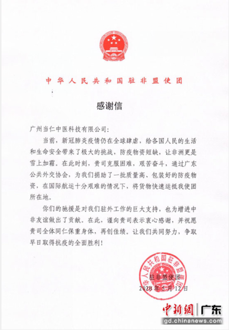 “广东当仁中医科技有限公司:当前,新冠肺炎疫情仍在全球肆虐,给各国人民的生活和生命安全带来了极大的挑战,防疫物资短缺,让非洲更是雪上加霜。在此时刻,贵司克服困难,艰苦奋斗,通过广东公共外交协会,为我们捐助了一批质量高、包装好的防疫物资,在国际航运十分艰难的情况下,将货物快速运抵我使团所在地。你们的驰援是对我们驻外工作的巨大支持,也为增进中非友谊做出了贡献。在此,谨向贵司表示衷心感谢,并祝愿贵司全体同仁保重身体,再创佳绩。让我们共同努力,争取早日取得抗疫的全面胜利。”