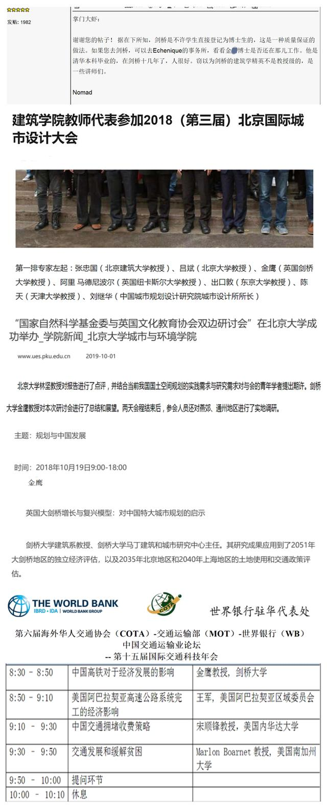 有网民反映剑桥大学建筑系的教学状况,引起媒体关注。本站也在剑桥官网查询,确定教授一栏中没有金X。而在讲师中,有金X的个人介绍。但其在各类活动中一直存在夸大宣传的可能,称谓是剑桥的"教授"级别,并多次参加国内活动。下面我们盘点一下,所谓的"金教授"在国内参加的各类活动。