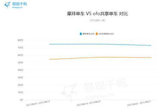 数据显示,8月最后一周(8月21日~27日),摩拜单车日均活跃用户量达729万,ofo则以568万排名次席,摩拜领先幅度达28%,并居行业榜首。此外,8月最后一周中,摩拜单车周活跃用户量达1945万,继续领跑。ofo则以1658万坐实行业第二。
