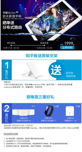 荣耀Waterplay防水影音平板将于10月24日10:08正式开售!届时将在华为商城、天猫荣耀官方旗舰店、京东荣耀官方旗舰店三大平台同步启动首轮销售。此次开售版本分为3GB+32GB WI-FI版(香槟金/皓月银)、4GB+64GB WI-FI版(香槟金)、4GB+64GB LTE版(香槟金),售价分别为1999元、2399元、2699元。用户当天只要购买荣耀Waterplay平板(不限版本),即有机会获得原装支架一份;并且在11月23日前参与晒单,更有机会获得路由、手环等三重好礼。
