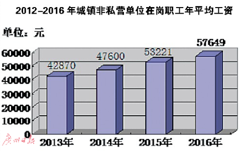 2013年,东莞城镇非私营单位在岗职工年平均工资42870元。2016年,城镇非私营单位在岗职工年平均工资达57649元,比2013年增长34.5%。可见,平均工资水平稳步提升。