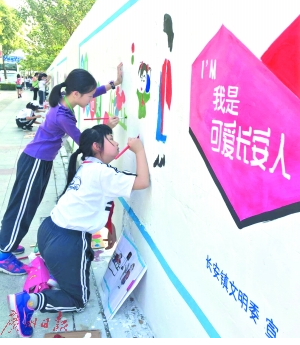 记者现场看到,有关人士预先在白墙上用线条描绘多幅主题画,老师、学生和家长志愿者们则认真地为这些传达公益、文明、和谐正能量的图画涂上色彩。