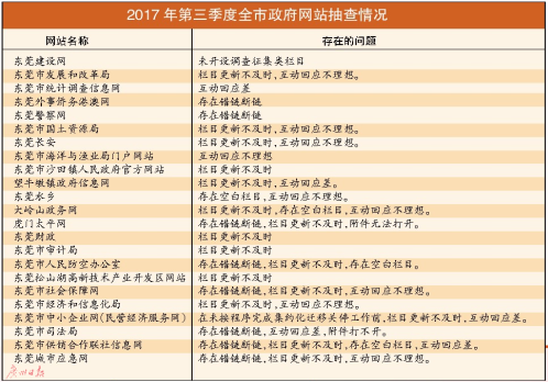 据了解,东莞市本次政府网站抽查范围为各镇街(园区)、各部门在全国政府网站信息报送系统中登记并正常运行的102个政府网站,共抽查32个,抽查比例为31.4%。其中,市直属部门网站22个,镇街政府网站和园区管委会网站共10个。