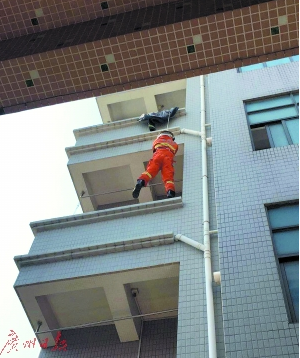 很快,副班长杨志威将安全绳绑在自己的腰间,卢有仪和另一名队友拉住安全绳的另一端,慢慢地将杨志威从4楼阳台放下。杨志威通过3楼阳台进入出租屋里,将孩子安全救出。