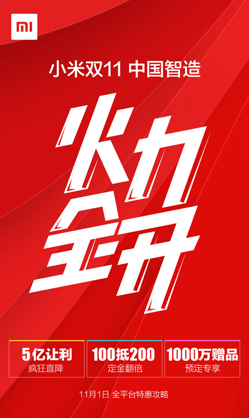 今日,小米发布了“小米双11 中国智造 火力全开”主题活动的首波攻略。此次双11,小米仍然启动了天猫、京东、苏宁、小米商城以及线下小米之家的全平台双11特惠计划,从11月1日到11月11日,让利总金额高达5亿。同时,小米在天猫、京东、苏宁平台提供价值1000万预定专享赠品。用户在11月11日之前的预售活动中预定部分指定产品,届时可享受最高100抵200的定金翻倍大礼。