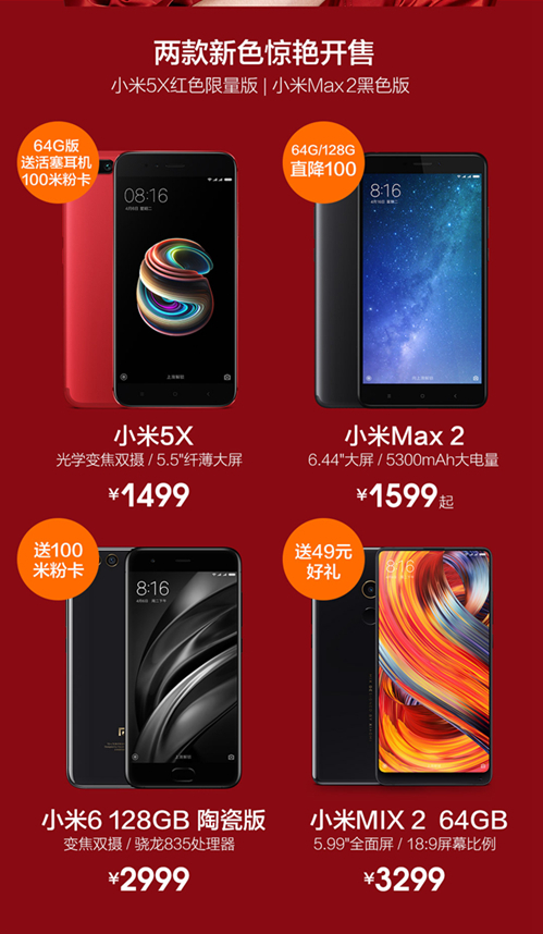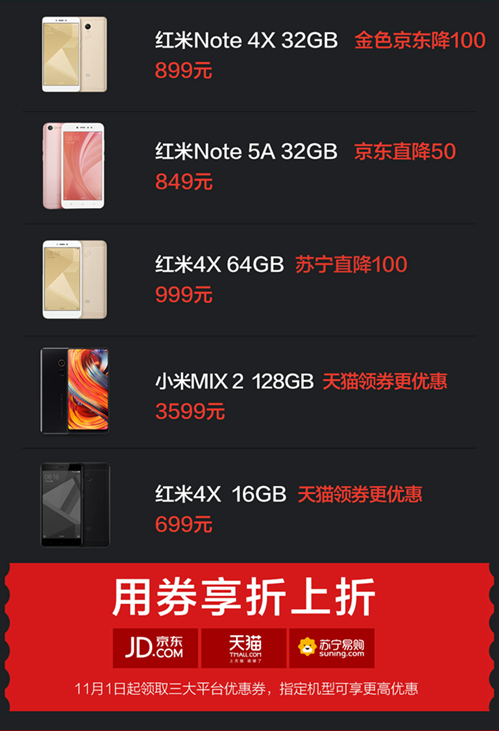 此外,多款小米和红米的明星机型都将在此次双11中同台亮相,涵盖小米6、小米MIX 2、小米5X、红米Note 4X、红米Note 5A、红米5A等诸多爆款,备货超百万台。