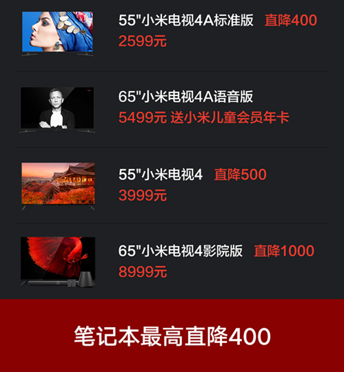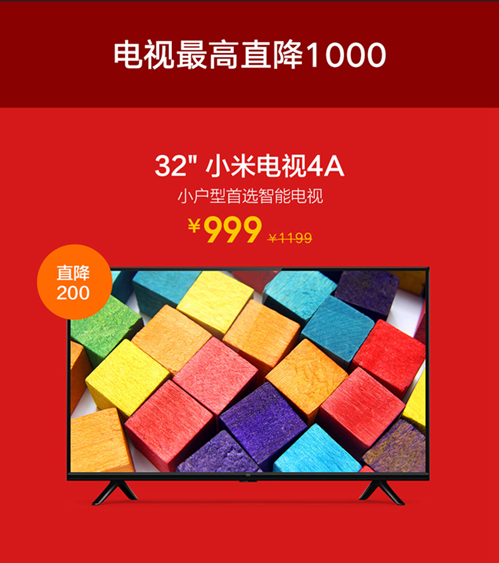 其中,带领智能电视进入百元时代的小米电视4A 32英寸版将以999元的全新价格,从11月1日开始在全平台开售。另外55英寸标准版小米电视4A直降400,仅售2599元;55英寸版小米电视4直降500,仅售3999元;65英寸影院版小米电视4直降1000,仅售8999元;65英小米电视4A语音版5499元,购买即送小米儿童会员年卡。