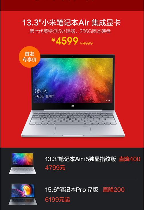 在双11期间,用户购买13.3英寸小米笔记本Air集成显卡版,可享受4599元的首发专享价,13.3英寸小米笔记本Air i5指纹版直降400,特惠4799元起,15.6英寸小米笔记本Pro i7则直降200,特惠6199元起。
