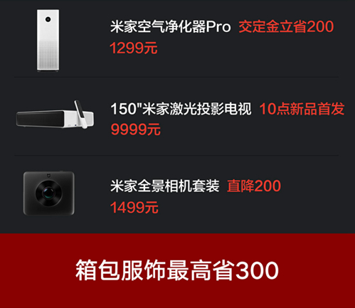 在新品方面, 80~150英寸超大投影尺寸的米家激光投影电视也将在11月1日首卖。小米生态链在双11期间还将陆续推出神秘新品,目前官方尚未披露消息,但从生态链产品的品类布局来看,已经在逐步向米粉们特别期待的出行、美护、白电等领域拓展,值得期待。