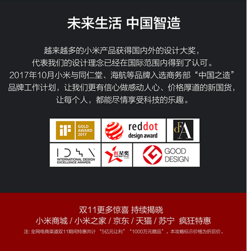 同时小米方面表示,越来越多的小米产品获得国内外的设计大奖,代表我们的设计理念已经在国际范围内得到了认可。2017年10月,小米与同仁堂、海航等品牌入选商务部“中国之造”品牌工作计划,让我们更有信心做感动人心、价格厚道的新国货,让每个人都能尽情享受科技的乐趣。
