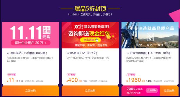 来自硅谷的Striking1y的中文版建站工具在“双11”期间由980元/季度直降到11.11元/季度;互联网资质ICP许可证“双11”期间仅需1元钱;驻云CloudCare产品下单用户享受满9000减800折扣;