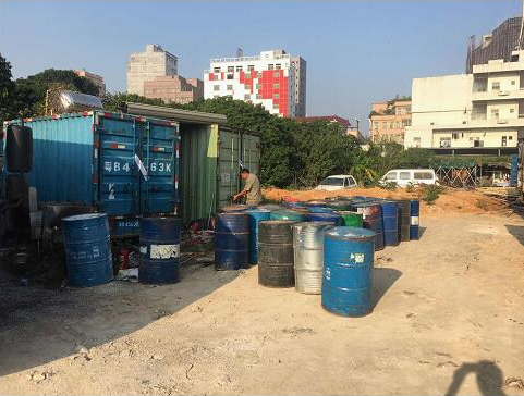 在现场,发现4辆报废车(粤B8Q1858、粤ML1779、粤S36319等3辆油罐车,粤B4563K厢式货车)和3个废置旧车厢,油罐车内装有“环保油”和柴油,车厢内分别有2个8吨、1个2吨的铁制油罐及一批油泵、油枪等设备,但无发现相关经营者。