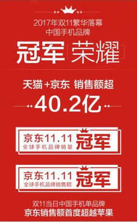 2017年双11在战火硝烟中落下帷幕,荣耀手机凭借双旗舰荣耀V9、荣耀9以及千元全面屏畅玩7X等产品的优秀表现,稳居榜首,夺得京东平台单日全球手机品牌销量、销售额双冠军,一举击败苹果,上演中国荣耀;荣耀手机登顶销售额冠军宝座,也打破了京东平台双11当日,苹果单品牌销售额无法超越的神话。