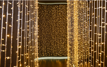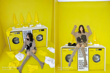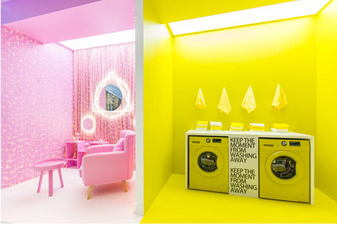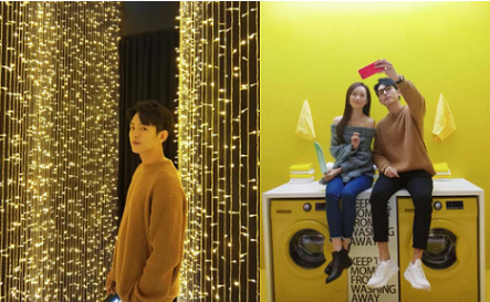 整个店铺分为三个主拍摄区域:清晨印象、午夜星空和OPPO Fairyland,其中午夜星空由无数垂下的灯条组成,整个走廊看起来就像灿烂的星空;而粉色的少女房间和黄色洗衣房则是拍照最出效果的地方。