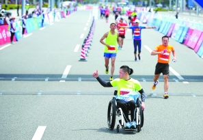 林文超1岁时因患小儿麻痹症导致腿部残疾,一直需要借助拐杖才能行走。“我从小就没体验过奔跑是什么滋味,我想弥补这一缺憾。”他说,第一次参加马拉松比赛时只有他自己一个是坐着轮椅“跑”的,一下子成为了全场的焦点,他心里也有些胆怯。但也正是因为马拉松,林文超觉得身患残疾的人不要自己看轻自己,要勇敢地走出去,这样才能更好地融入社会。“比赛参加多了,我就不断总结,认为自己应该为残障人士这个群体做点事情。”林文超说。