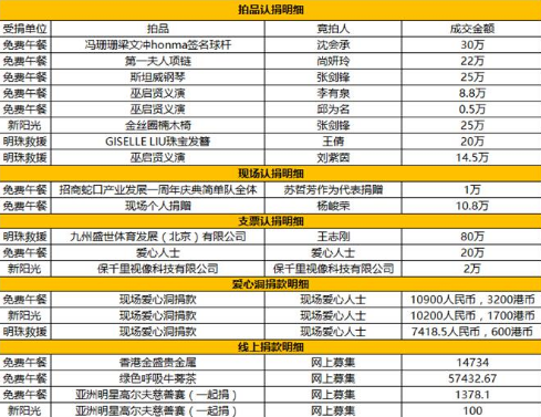 此外,拍卖会现场还引发了不少爱心人士与爱心企业的热情,中国福利基金会免费午餐基金秘书长苏哲芳女士代表招商蛇口产业发展一周年庆典简单队全体,现场捐出1万;明星代表、知名音乐制作人杨峻荣现场捐出10.8万,这两笔善款都会捐向中国福利基金会免费午餐基金。与此同时,爱心企业也不忘鼎力支持;九州盛世体育发展(北京)有限公司,捐出80万,这笔善款全部捐向中国扶贫基金会明珠慈善基金。保千里视像科技有限公司,捐出2万,这笔善款会捐向北京新阳光慈善基金会。