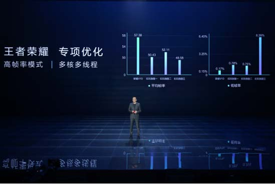 令人惊喜的是,针对当下最火爆的《王者荣耀》手游,荣耀V10进行了专项优化,适配了《王者荣耀》的高帧率模式,并且在高帧率的模式下,手机运行游戏半小时,相比其他手机,荣耀V10的帧率可保持在57.38以上,给用户强悍体验。同时,多核多线程的优化也将跟随《王者荣耀》的版本升级进行适配。高帧率模式+18:9的全面屏视野,无疑是帮助玩家上分的一个重要利器,游戏玩家终于迎来一款可以玩到上瘾的手机。