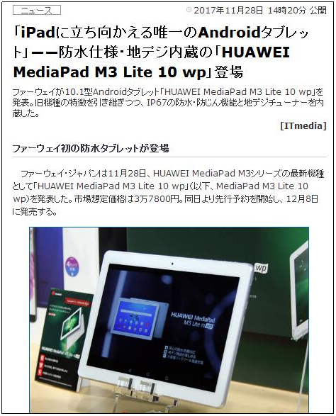 (日本,11月28日)当地时间11月28日,防水影音平板华为荣耀Waterplay(日本上市名:HUAWEI MediaPad M3 Lite10 wp)在日本举行盛大的新品发布会,并于发布会当天即面向用户接受预约,12月8日正式发售,在日开售含税价为40824日元,约合人民币2397元。会后日本重磅媒体IT media PC USER、PC Watch等在报道中对该款产品的防水防尘等亮点功能给予极高的评价,日本电子产品TOP3评论媒体IT media认为,这是唯一可以与iPad抗衡的Android平板!
