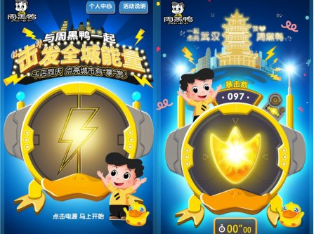 除了线下盛大的公关事件,周黑鸭在线上更同步发布“点亮城市之光”H5,邀七城粉丝一同狂欢。活动期间,人们只需点进H5,与“鸭掌发电机”击掌,即可为自己选择的城市“击”发能量;更可与全国小伙伴比赛,看谁最快点亮地标!“鸭粉”的热情参与,也为周黑鸭带来了可观的网上话题热度。