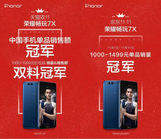 国内发布后,荣耀畅玩7X销情火爆,其中在双11当天,荣耀畅玩7X在天猫平台前两小时爆售30万台,并一举夺得双十一当天中国手机单品销售额冠军、1000-1999元价位段销量&销售额双料冠军,是天猫平台1000元以上最畅销机型。京东平台仅在11月11日当天开售不足2小时,即获得京东平台11月1日-11日连续11日的1000-1499价位段手机销量冠军,助力荣耀历史性地在双十一当天,成为首个在大促节点销售额超越苹果的中国手机单品牌,也助力荣耀成为双十一期间的全球手机品牌销量冠军,全球手机品牌销售额冠军。