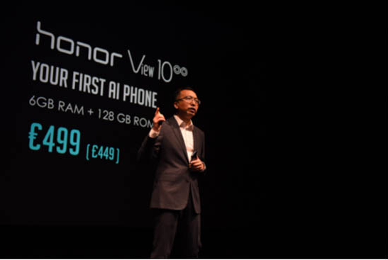 (12月5日,伦敦)北京时间12月5日晚,荣耀新品全球发布会于英国伦敦盛大举行,年度AI旗舰荣耀V10正式亮相海外。作为荣耀第二代人工智能手机,荣耀V10通过麒麟970人工智能芯片+EMUI8.0的独创软硬双AI技术,使手机AI体验领先行业半年,真正实现理念颠覆,掀起全球AI速度革命浪潮。荣耀V10 6GB+128GB版本海外售价达499欧元。而荣耀V10国内售价按照存储容量不同分别为4GB+64GB标配版2699元,6GB+64GB高配版2999元和6GB+128GB尊享版3499元,通过荣耀V10,荣耀真正引领AI手机在全球的普及潮。