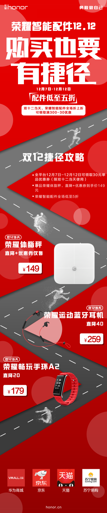 以荣耀近日亮出的配件产品优惠政策为例,主要线上促销平台还是以华为商城、天猫、京东、苏宁为主,智能配件产品在双12当天,依然可以享受全场最低5折的优惠,除此外领取满300减30优惠券还可享受折上折。